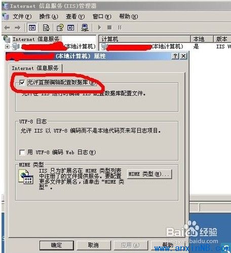 接下來也是重要的一步了,編輯IIS配置數據庫配置文件,在此操作之前,我們應該關閉IIS服務器才能進行接下來的操作,當然我們也可以不關閉IIS服務器,我們雙擊IIS服務器,右鍵點擊本地計算機,點擊屬性,在允許直接編輯配置數據庫上打鉤,那么我們不用關閉IIS就能直接配置服務器配置數據庫配置文件了