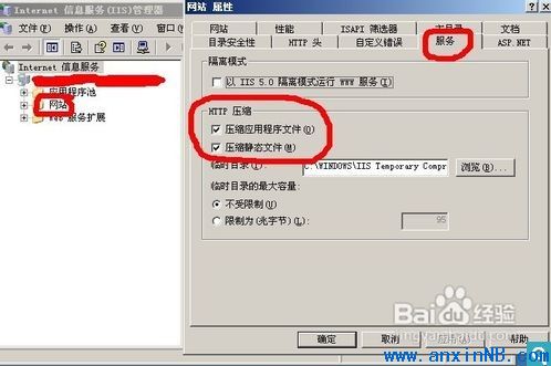 雙擊IIS服務器,右鍵點擊網站,點擊屬性,然后點擊服務,我們看到HTTP壓縮,然后在壓縮應用程序文件,壓縮靜態文件中打鉤,然后點擊確定,第一步就完成了
