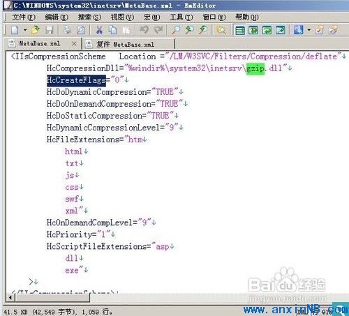 我們找到C:\WINDOWS\system32\inetsrv下的MetaBase.xml文件,操作這個文件之前應該先復制一份,以免出現意外的情況.打開此文件,搜索deflate,找到HcDoStaticCompression原來為false改為true,HcDynamicCompressionLevel原來為0,改為9,HcFileExtensions里面就可以添加我們需要壓縮的后綴,這里添加的是靜態文件,一般壓縮html,js,css圖片不列為壓縮之列.動態的文件可不可以壓縮呢,當然可以HcScriptFileExtensions里面就是填寫要壓縮的動態文件.配置完這個,我們要來配置下面的gzip,他們兩個緊挨著的,配置方法相同.