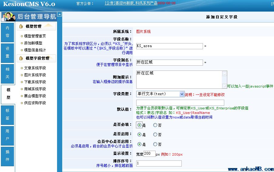 添加欄目完成后,根據我們剛才的分析,需要調用參賽者的所在區域,需要自定義字段,我們點擊模型管理—圖片系統字段進入新增字段,如下圖: