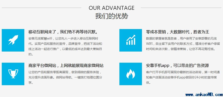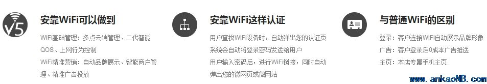 對服務商的好處:利用賬號登錄頁面及登錄后彈出頁面這一特有資源,可以為Portal定制“VLAN+端口+IP地址”的個性化認證頁面,同時可以在Portal頁面上開展廣告業務,內置服務選擇和信息發布等內容,進行業務拓展,實現Wi-Fi網絡的運營。像網格商用WiFi營銷系統就是這種為企業定制手機移動官方主頁(商鋪),還提供移動網絡營銷方案(包括WiFi廣告和移動端的SNS營銷,如微信微博營銷)的服務商。