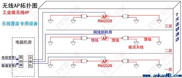 在每一樓層放置一套無線AP,無線AP通過POE供電于機房相連,無線AP通過饋線連接吸頂天線安裝在走廊,每個天線相距10-20米,每個天線覆蓋6-10個房間,采用無線AP雙路輸出可接2-4個吸頂天線能覆蓋16-24個房間。