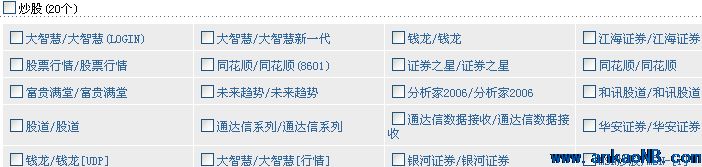 對于內網員工訪問各種網頁的行為,通過內置URL庫,關鍵字過濾等方式進行管控。對于采用SSL方式加密的網頁,如釣魚網站等,證書驗證鏈接黑白名單技術同樣可以管控。安全網關不僅可以對員工使用WEB、FTP、EMAIL等常用服務進行控制,通過深度內容檢測技術,根據應用數據包四層到七層的特征碼,實現對QQ、MSN、SKYPE等IM聊天工具,BT、電騾等P2P下載工具,PPLive、QQLive等在線影音工具,網絡游戲,在線炒股等網絡應用行為進行管理和控制。具有國內全的應用協議識別庫,例如對IM聊天工具、炒股軟件的識別庫如下: