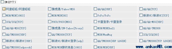 IM控制 | 可分組、分用戶、分時段封堵所有聊天軟件如:QQ、MSN、新浪UC、Yahoo Messenger、網易泡泡、Skype、飛信等 | |