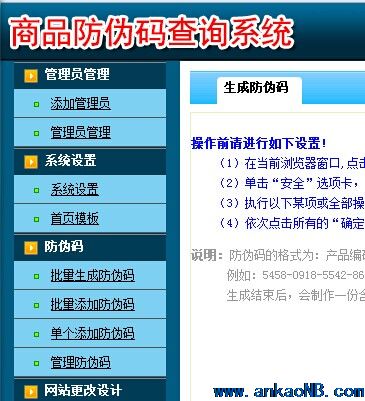 系統原理:1.后臺批量生成防偽碼 2.導出防偽碼 3.印刷防偽碼 4.把防偽碼貼在產品上 5.用戶購買后登陸網站查詢真偽!