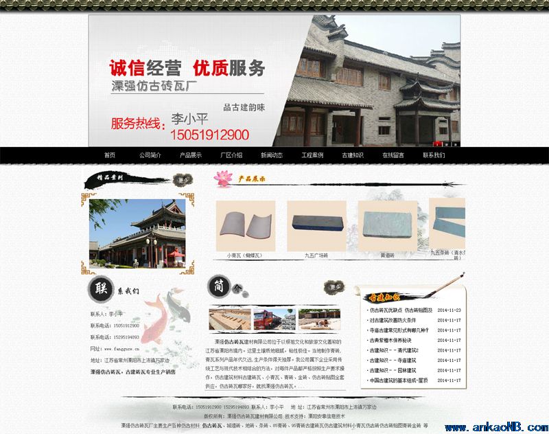 溧強仿古磚瓦http://www.fangguzw.cn建材有限公司位于以根祖文化和旅游文化著稱的江蘇省溧陽市境內。這里土壤質地細膩,粘性極佳。當地制作青磚,青瓦系列產品年代久遠,生產條件得天獨厚。我公司屬下企業采用傳統工藝與現代技術相結合的方法,對每件產品都嚴格按照生產要求操作,產品具有表面光滑,手感細膩,質地堅硬,聲音清脆,顏色一致等特點。能夠保證各類文物修繕及仿古建筑所需磚瓦,磚雕等系列產品的質量。